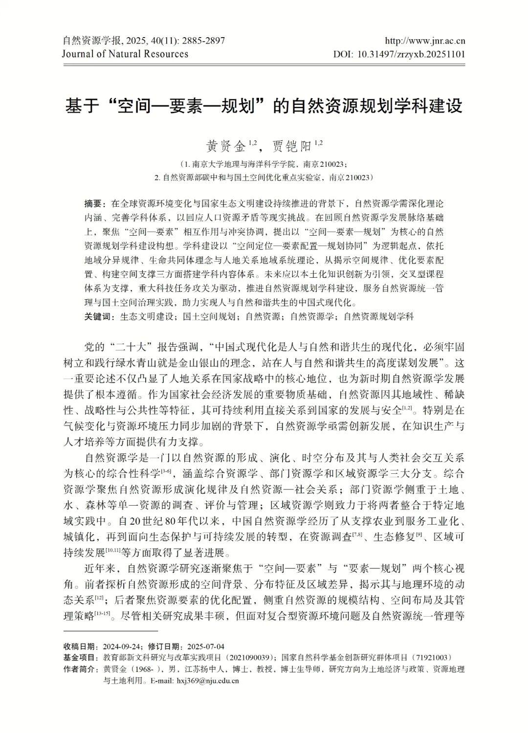 在此背景下,南京大学黄贤金教授团队在《自然资源学报》2025年第11期发表了《基于“空间—要素—规划”的自然资源规划学科建设》一文。该文在回顾自然资源学发展脉络基础上,聚焦“空间—要素”相互作用与冲突协调,提出以“空间—要素—规划”为核心的自然资源规划学科建设构想,旨在深化完善自然资源学知识体系,助力实现人与自然和谐共生的中国式现代化。其主要观点包括:(1)自然资源规划学科建设应以“空间定位—要素配置—规划协同”为逻辑起点。其中,“空间定位”明确地域空间的自然地理特征和环境承载力;“要素配置”整合土地、水、森林等资源要素的属性与交互;“规划协同”则以国土空间规划与用途管制为抓手,确保“顺应自然、保护自然”理念的落实。(2)学科构建应依托地域分异规律、生命共同体理念与人地关系地域系统理论三大理论支柱:地域分异规律构成“空间定位”的自然地理前提;生命共同体理念为“要素配置”提供生态协调的价值准则;人地关系地域系统理论为“规划协同”提供治理逻辑。(3)学科内容体系应从基础研究到应用实践聚焦于三个层面,即揭示空间规律、优化空间选择、构建空间支撑,形成完整的知识框架。